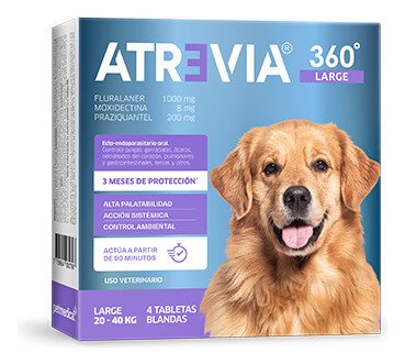 Atrevia 360° es un antiparasitario oral de amplio espectro para perros, que combina una tableta masticable trimestral para controlar pulgas, garrapatas, ácaros y varios parásitos internos (nematodos, céstodos) en una sola dosis, ofreciendo una protección completa y simplificando el manejo de la desparasitación, ideal para un plan integral y preventivo.