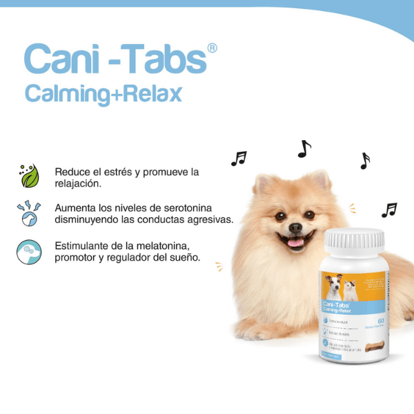 Cani-Tabs Calming & Relax es un suplemento formulado para ayudar a reducir el estrés y promover un estado de calma en perros. Ideal para situaciones como viajes, tormentas, visitas al veterinario o ansiedad leve.