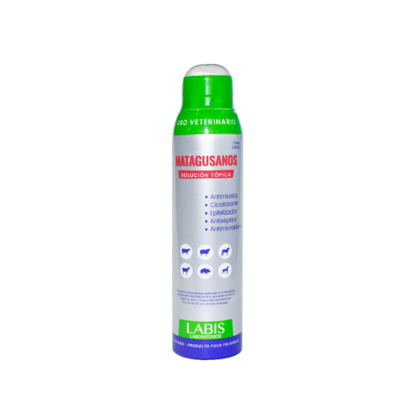 Spray Mata Gusanos Labis es un producto de uso veterinario diseñado para el tratamiento y control de larvas en heridas externas de animales. Su presentación en spray facilita la aplicación directa sobre el área afectada.